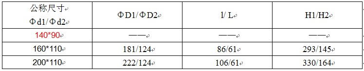 其中“ΦD1”表示管件主管口公称外径,“Φd1”表示管件主管口公称内径,“ΦD2”表示管件支管口公称外径,“Φd2”表示管件支管口公称内径,“L”管件主管口承插长度,“l”表示管件支管口承插长度,“H1”管件长度,“H2”表示管件中心距,1.0MPa=10公斤