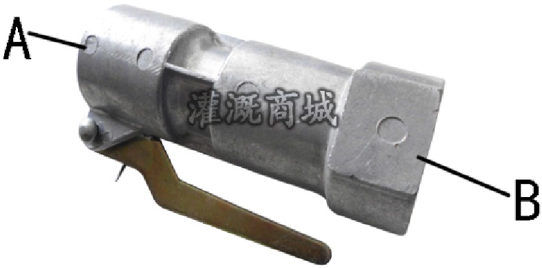 方便体的特点及用途: 1.“A”为卡口端,与立杆相连接,“B”为丝口端(内螺纹),与输水管道连接。 2. 立杆插入时立即取水,立杆取出时立即闭水。