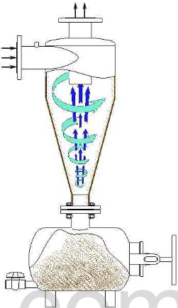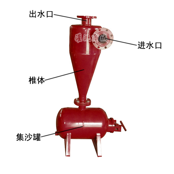 基于重力及离心力的作用,清除重于水的固体颗粒。水由进水管切向进入离心过滤器体内,旋转产生离心力,推动泥沙及密度较高的固体颗粒沿管壁移动,形成旋流,使沙子和石子进入集砂罐,净水顺流沿出水口流出,完成水沙分离。